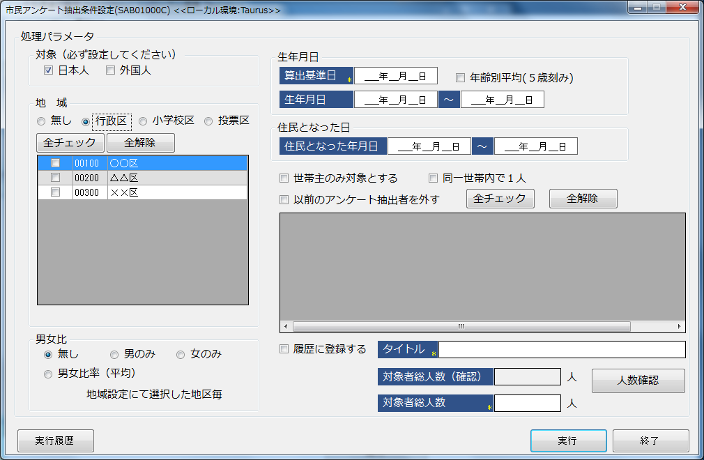 アンケート対象の抽出条件・対象者総人数を入力し、対象者一覧・件数表の出力や過去の抽出履歴を管理するシステムです。 抽出したい件数を入力することにより、人口比率より行政区・年齢別に対象者の抽出ができます。 |